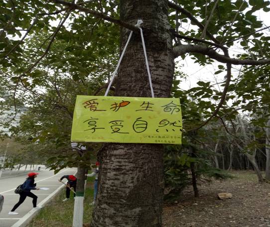 (图为志愿者制作的树木环保标语)