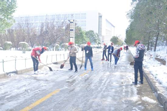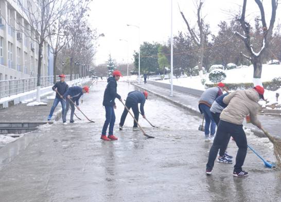 中午12点,志愿者们在十号楼大厅集合完毕,负责人随即给大家分配工具并安排扫雪任务。活动开始,志愿者们拿着扫帚、铁锹等除雪工具对路面上的积雪和薄冰进行全面清理,把过路的同学们引领到已清理过的安全道路上,同时告诫员工们冬季保暖的重要性,使同学们在寒冷的冬季感受到了一份浓浓的暖意。志愿者们不怕辛苦、不惧寒冷,在寒风中与积雪进行着斗争,他们的身影也成为了校园里一道靓丽的风景线。最终经过志愿者们的不懈努力,道路上的积雪薄冰全部清理完毕,恢复了原来的样貌。
