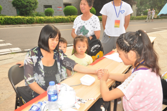 (图为志愿者义务为居民测量血压)