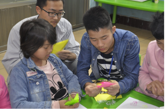 志愿者在教孩子们折纸