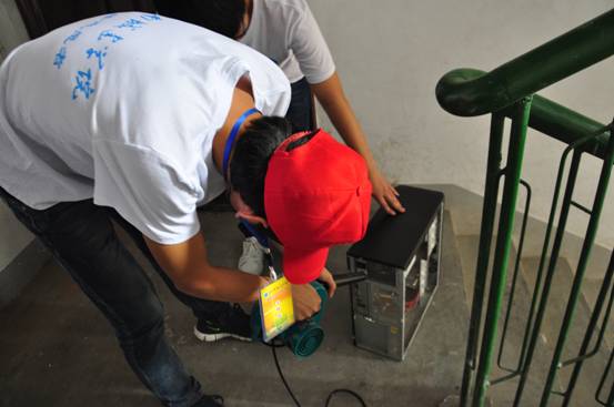 (图为志愿者上居民家里义务给机箱除尘)