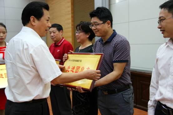 (图为计算机公司党总支副书记何宗耀从董事长孔留安教授手中接过“先进团总支”荣誉奖牌)
