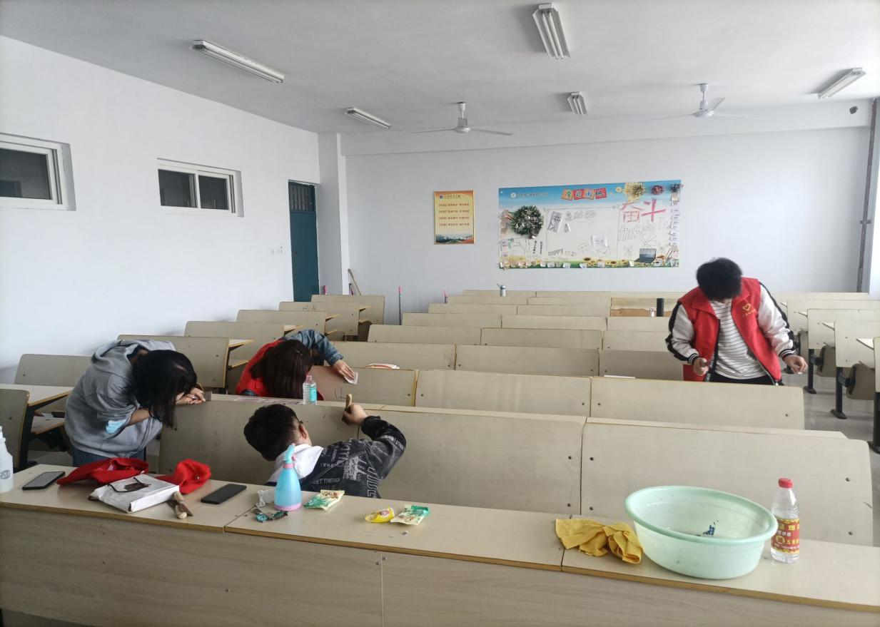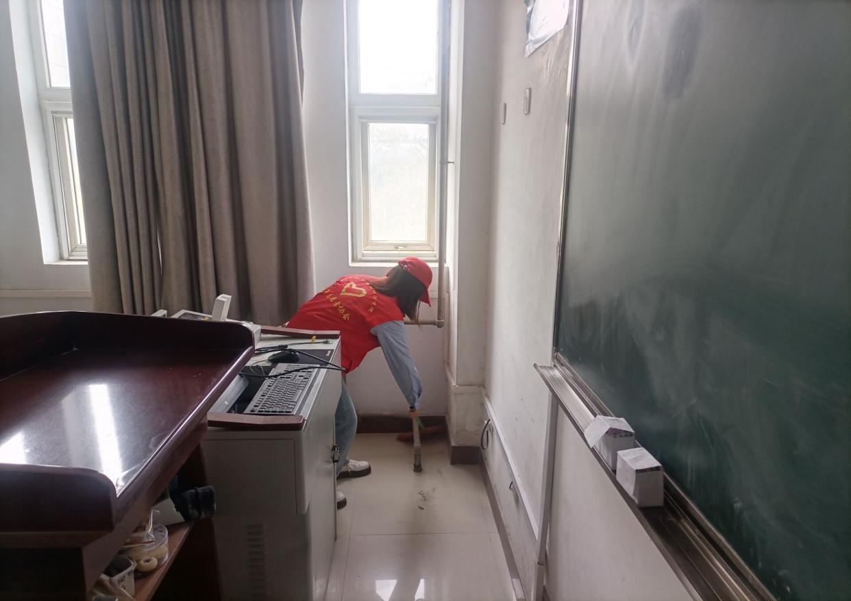 在进行简单的任务分配后,青协志愿者们分别对十号楼的楼道,考研教室、自习教室、公共教室、办公室等进行了彻底清理。各位负责人周密组织,各位志愿者积极参与,相互配合,积极清理垃圾,不怕脏,不喊累。经过大家一下午的努力,教室里已不见零食垃圾袋、演算纸等等垃圾的踪影,黑板被清理得没有一丝粉尘,垃圾箱也被擦拭得一尘不染,同时楼间的部分广告被清理得干干净净。志愿者们用自己的实际行动为同学们增添了一抹明亮。阳光下,滴滴汗水挂在她们自豪灿烂的脸上,显得如珍珠般耀眼闪亮。
