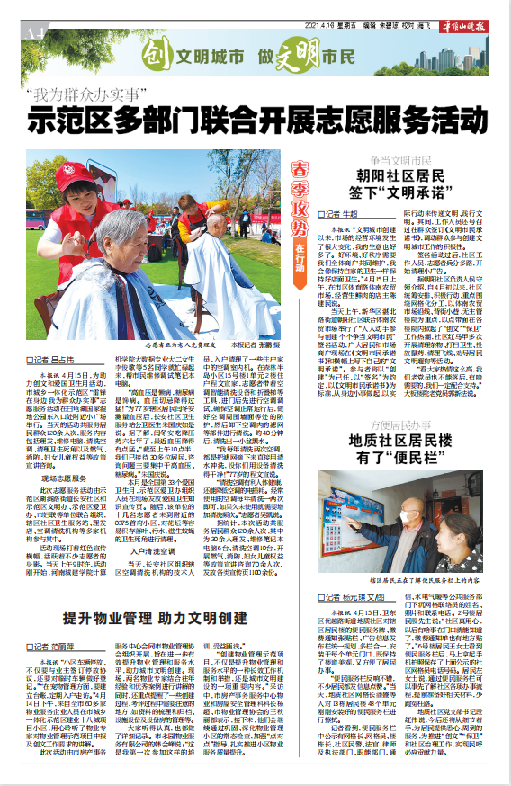 (通讯员 余美霞 周岸)4月15日上午,bevictor伟德官网青年志愿者协会代表伟德国际1946源自英国与社区青年志愿者协会在平顶山九天鹤大酒店旁草坪共同联合举办了“电脑维修”及其他各项互惠利民的志愿活动活动。活动中,公司志愿者们充分利用自身所学的专业知识,认真解决周边市民遇到的电脑难题,并向他们宣传电脑使用与维护方面的相关知识,赢得了市民的肯定和点赞,平顶山日报对此次活动进行了专题报道。此次活动弘扬和践行了雷锋精神,在实践中锻炼了公司志愿者们的动手操作能力,展示了公司学子良好的精神风貌。